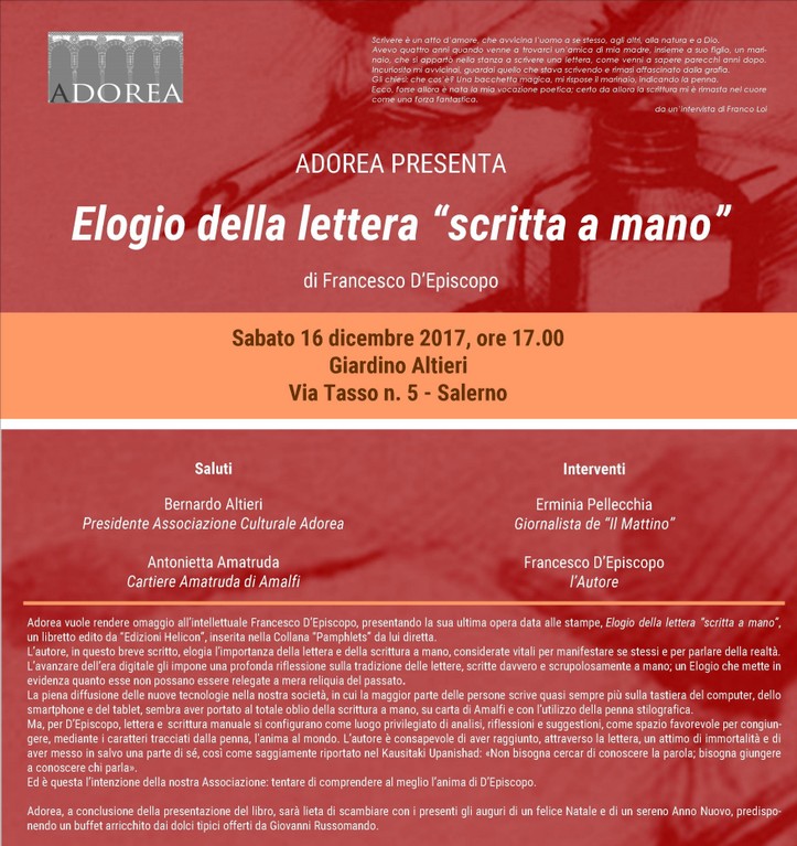 Adorea vuole rendere omaggio all’intellettuale Francesco D’Episcopo, presentando la sua ultima opera data alle stampe, Elogio della lettera “scritta a mano”, un libretto edito da "Edizioni Helicon", inserita nella Collana "Pamphlets" da lui diretta.