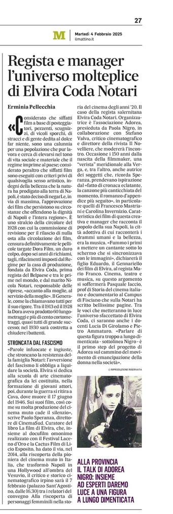 L'associazione culturale Adorea e la Presidente Paola Nigro, sono lieti di annunciare un evento dedicato alla prima regista donna della storia del cinema italiano: La salernitana Elvira Coda Notari (1875 -