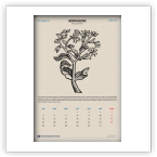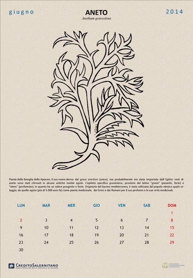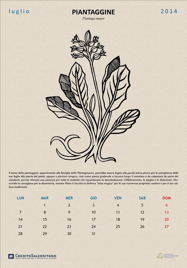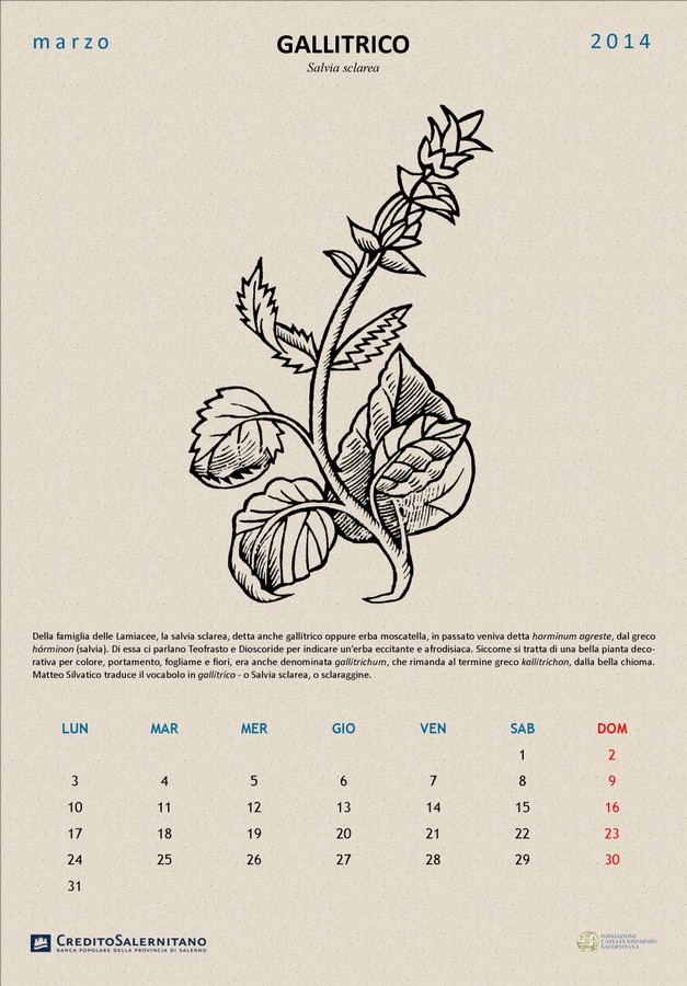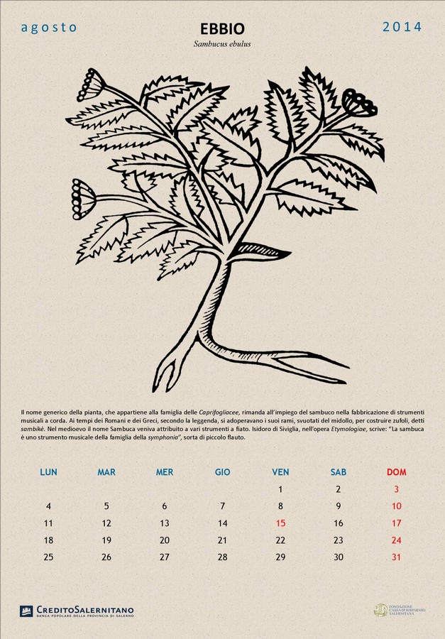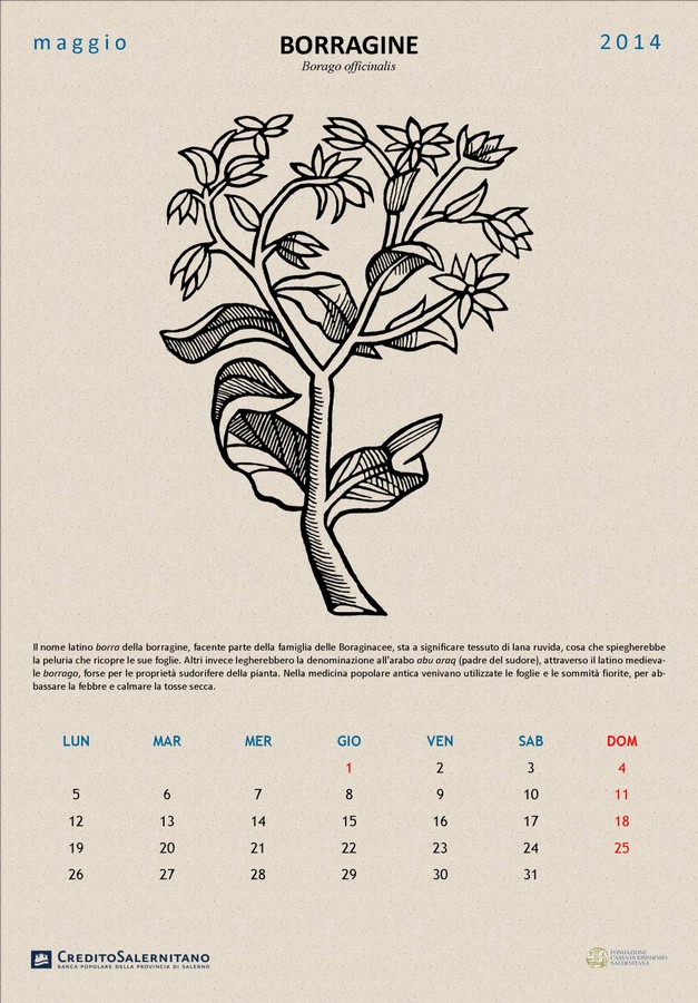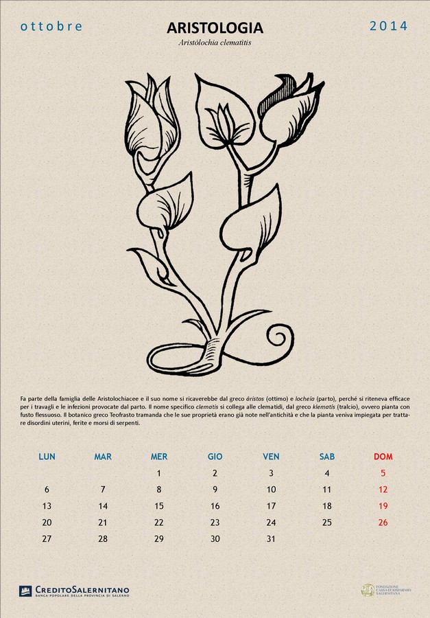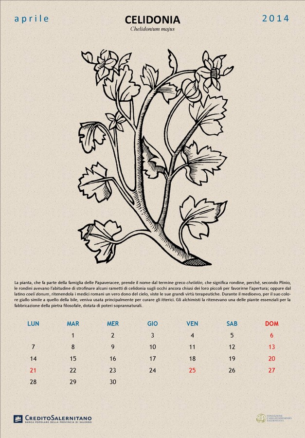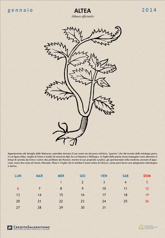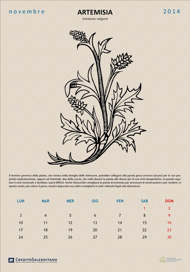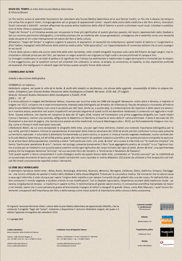 Il Calendario contiene la fedele riproduzione di dodici erbe, una per ogni mese dell’anno, tratte dall’Herbolario volgare posseduto da Bernardo Altieri, una rara edizione veneziana del 1534, nonché unica copia presente sul territorio nazionale, che ci rinvia al mondo vegetale medievale, nucleo centrale della Scuola Medica Salernitana, ed all’utilità pratica di queste erbe “semplici”, alfabeticamente descritte all’interno di questa piccola enciclopedia per le virtù essenziali finalizzate alla guarigione dalle infermità.