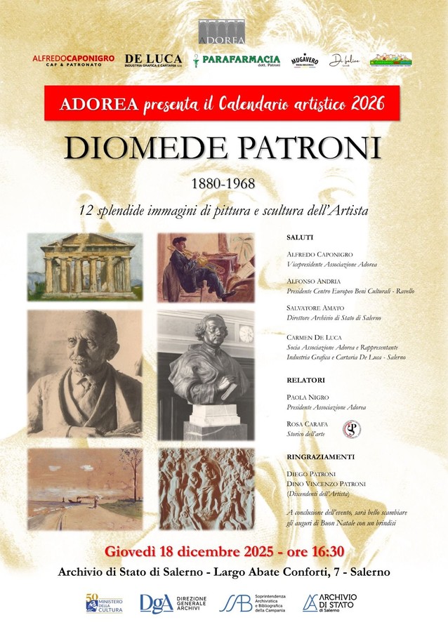L’Associazione culturale salernitana Adorea ha da sempre celebrato la bellezza dell’arte e della cultura come mezzo di ispirazione e di riflessione quotidiana. L’obiettivo di dedicare un progetto al recupero e alla valorizzazione storica delle opere di artisti del passato, è stato raggiunto per il 2026 con la progettazione e pubblicazione di un calendario d’arte volto alla divulgazione di 12 immagini tra pitture e sculture dell’artista Diomede Patroni (1880-